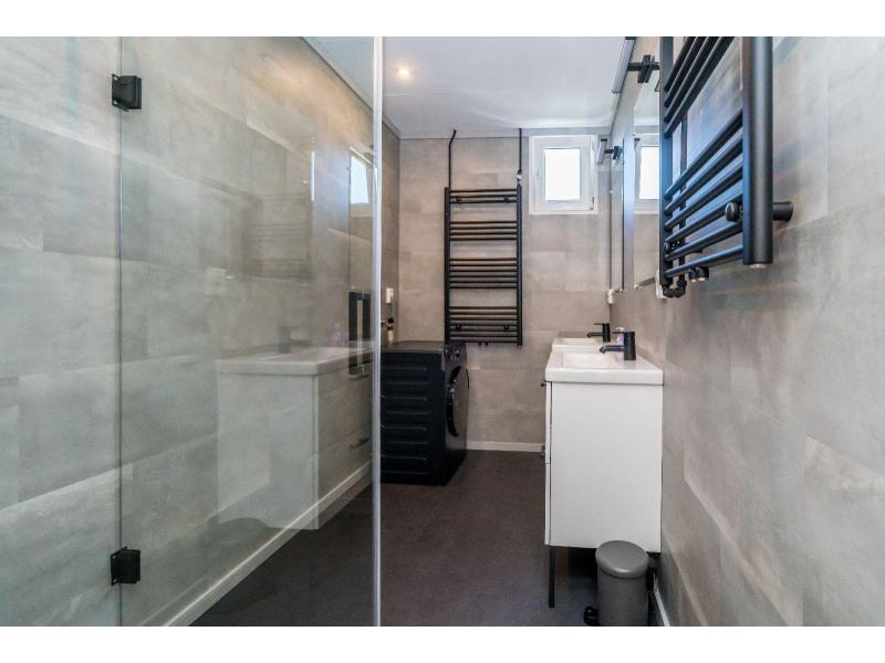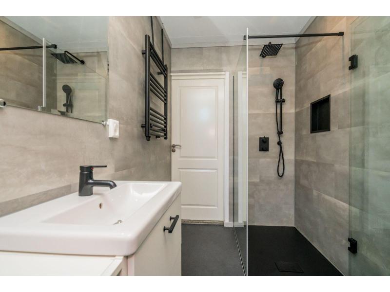 De moderne badkamer is stijlvol afgewerkt en voorzien van een heerlijke regendouche en een dubbele wastafel. Daarnaast is er een separaat toilet.